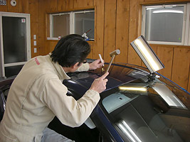 この場所はデントツールが入らないため施工不可と言われるケースですが 何とか塗装せずに直せないものかと言うオーナー様のご要望にお応えする為 表から引っ張り上げる「プーリング方」で施工致しました。 固そうに見えるパネルですが骨格となる部分はこのパネルの中、外板は意外と柔らかく 靴のかかとなどがコツンと当たるとへこむ場合もあります。 施工で心配だったのはへこみの下半分はチッピング塗装と言われる凸凹した部分に掛かっています。 この部分は景色の映り込みがぼやけるので正確に直ったかどうか見極めにくいですし 弾力もある為施工も困難になります。 引っ張ったり叩いたりを繰り返しながら元のラインに戻していくのですが 幸い当たり方が軽度であったため素直に鉄板も直ろうとしてくれ 綺麗に仕上がりました。チッピング部分も違和感なしですし ここが凹んでいたことはそのうち忘れて頂けるのではないでしょうか! オーナー様は当店2回目のご利用でしたので前回の作業で迷うことなくご依頼頂けました。 それだけに今回も期待に応えられてほっと一安心! もちろん前回同様喜んで頂けましたよ!! ![]() |